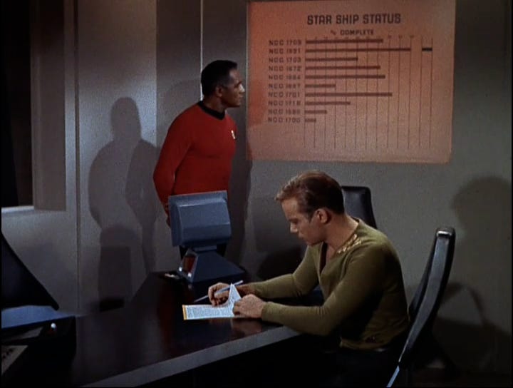 In Commodore Stone’s office, we see a wall chart listing the various starships in dock for maintenance. Their names are not listed but their registry numbers are. (One is NCC-1700, meaning at least one Constitution Class ship was built before Enterprise — the Constitution, presumably.)