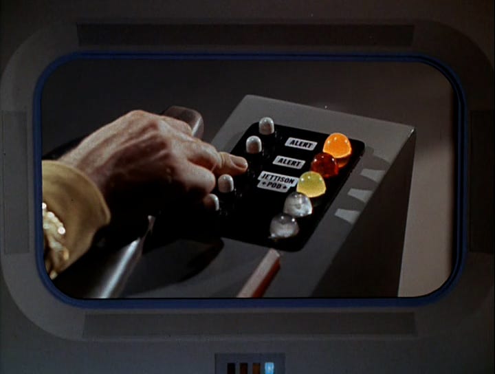 The video log shows Kirk pressing the JETTISON POD button on his command chair while still at yellow alert. (Which suggests there’s only one pod. Whatever it is.) “But that’s not the way it happened,” Kirk mutters.