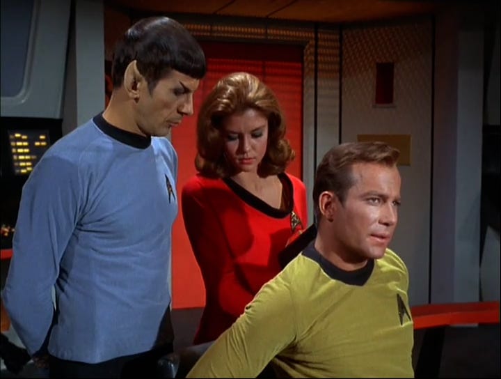 We’re introduced to another two-person scouting party. One of them is Lt. Angela Martine, the woman who was to marry Lt. Robert Tomlinson, killed in the Romulan battle in “Balance of Terror.” She seems flirtatious with her colleague, Lt. Esteban Rodriguez, so her grief apparently didn’t last long. The scene suffers from a continuity glitch; she’s still “Angela” but her last name is now Teller; according to Memory Alpha, the character was originally Mary Teller in the script. This reflects the haste with which the episode was rewritten.