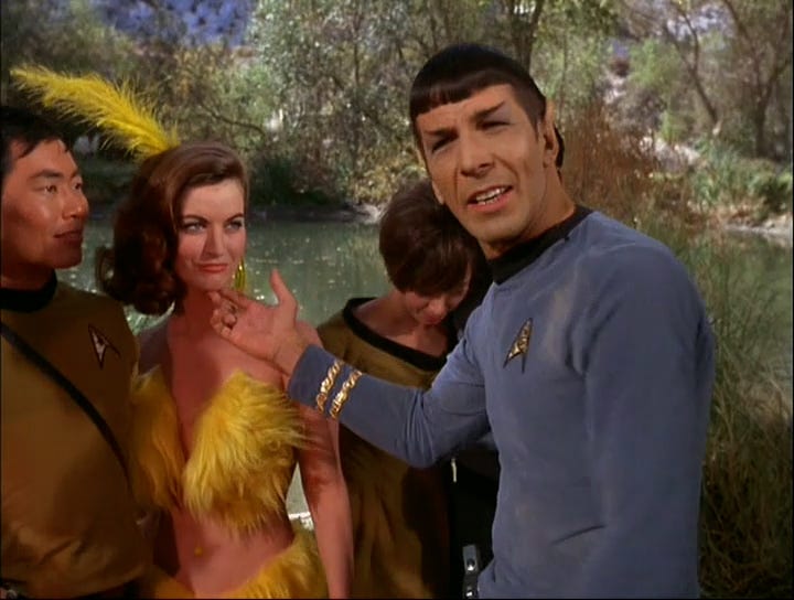 Spock shows a certain fascination with one of the showgirls. Atypical for his character.