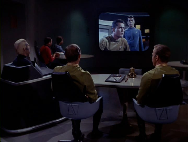 A court martial is convened, using the same set, props, and procedures just filmed in “Court Martial.” (Waste not.) The three judges are Mendez, Kirk, and Pike.