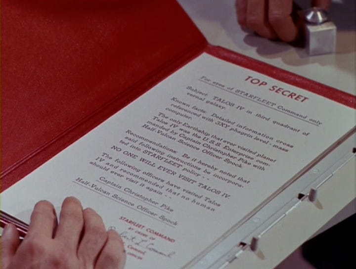 Mendez shows Kirk a booklet with a few details about Talos IV. Visiting that planet is the only remaining death penalty. The secret document reveals that the Enterprise once visited Talos IV. Two officers recommended that “no human should ever visit it again” — Captain Pike and “Half-Vulcan Science Officer Spock.”